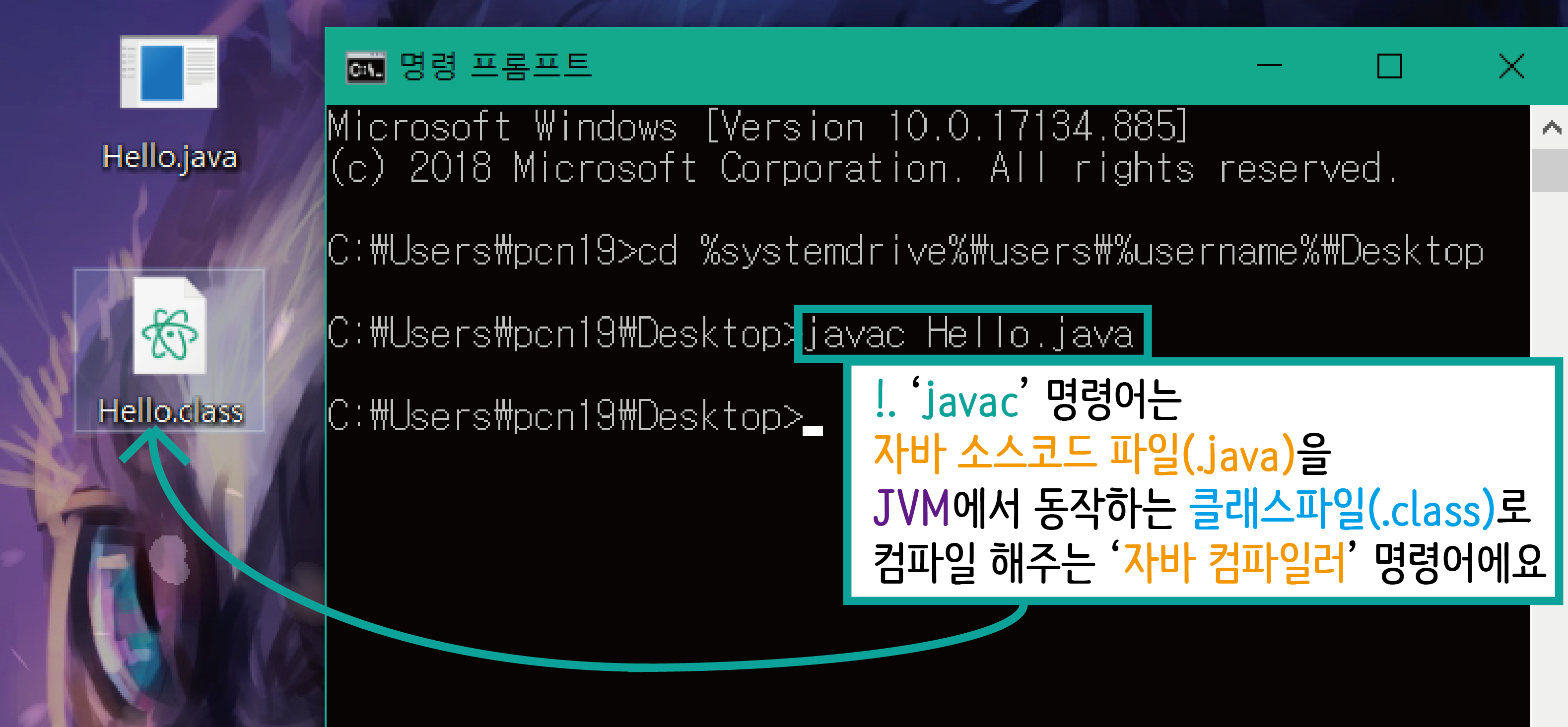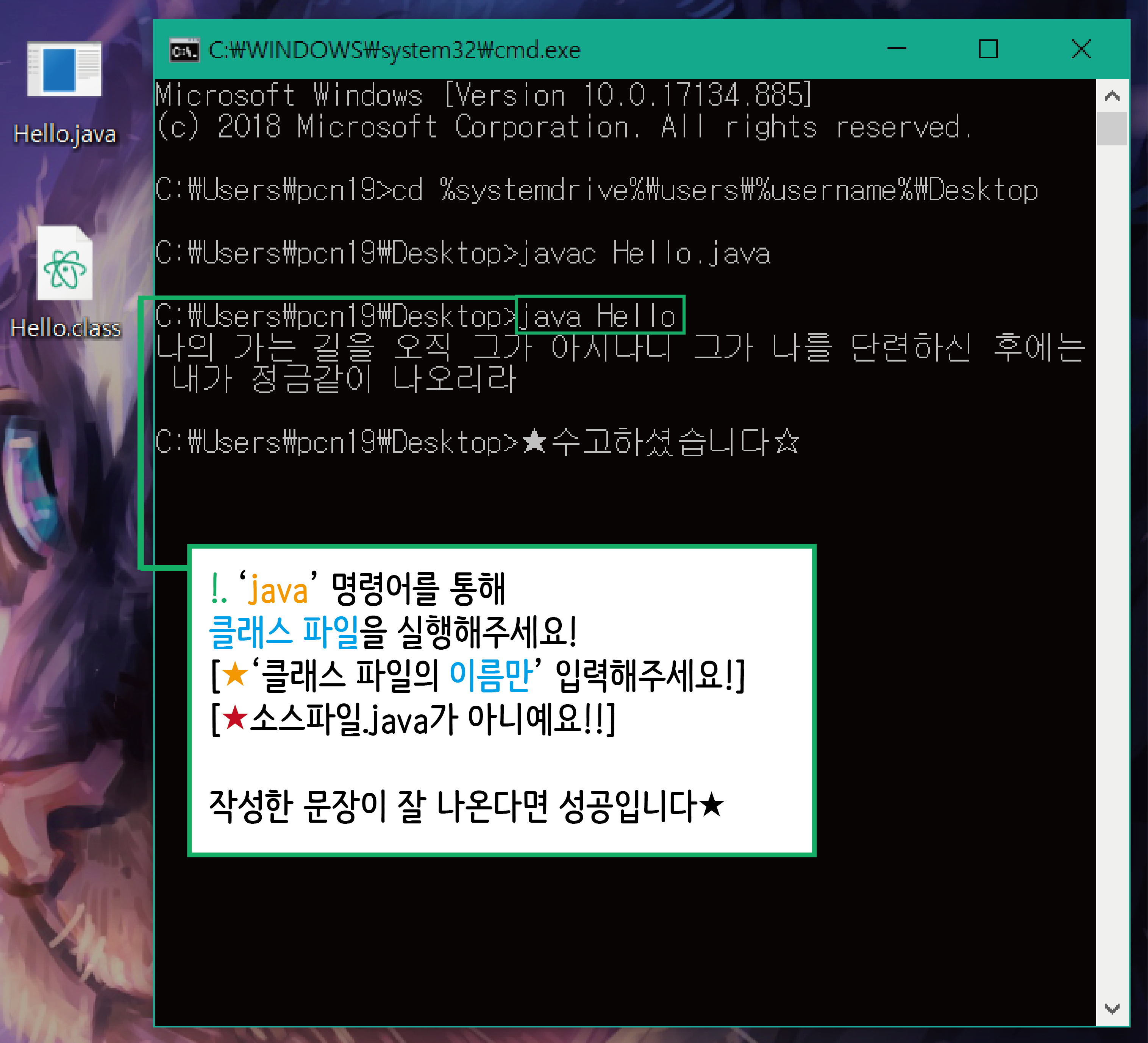 명령 프롬포트에서 'java ' 명령어를 통해 JVM 으로 변환된 클래스 파일을 실행 해주세요!