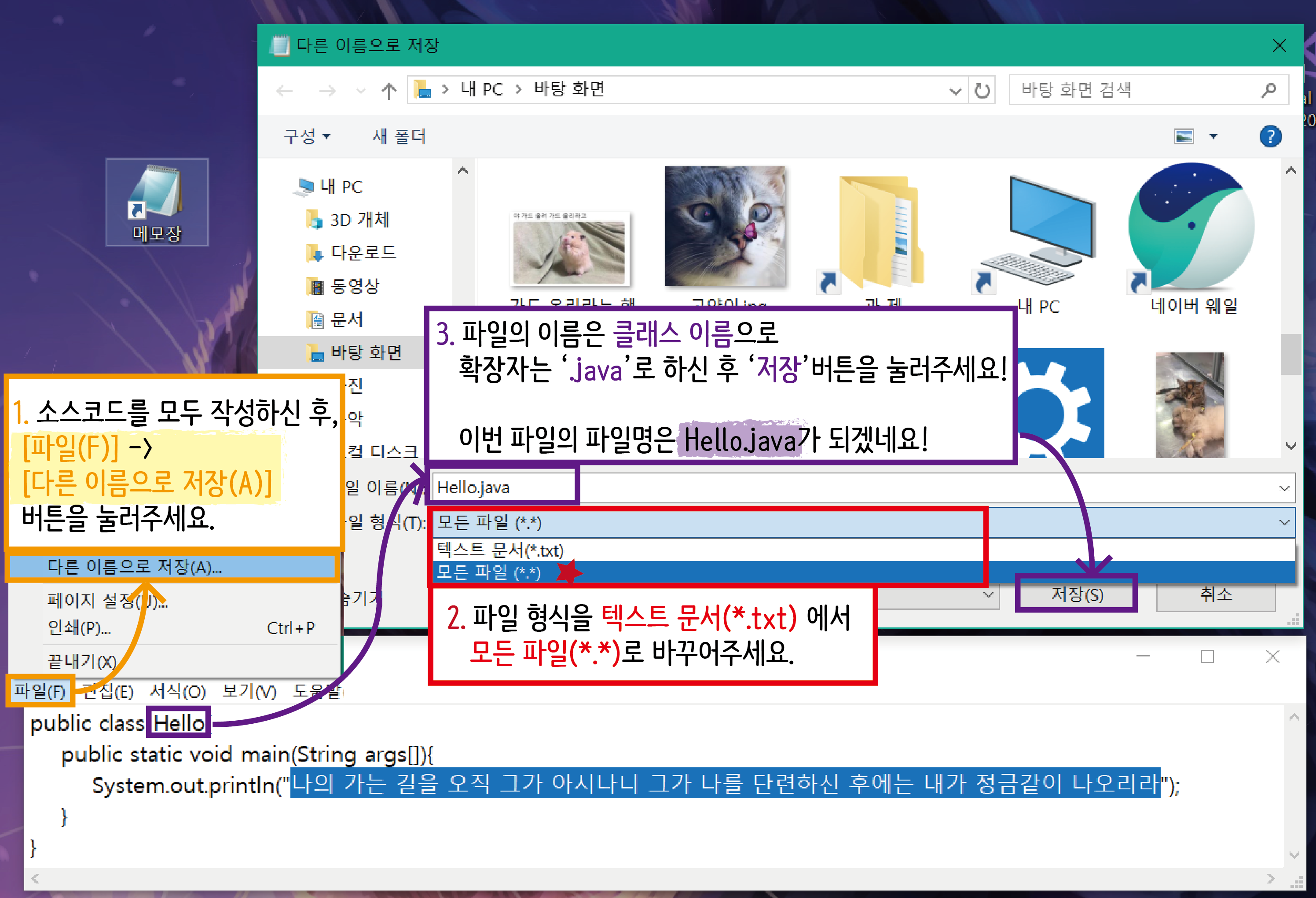 >2. 소스코드 작성을 완료하셨으면 다른 이름으로 저장 > 모든파일(*.*) > ' Hello .java ' 을 통해 파일 이름을 저장해주세요!