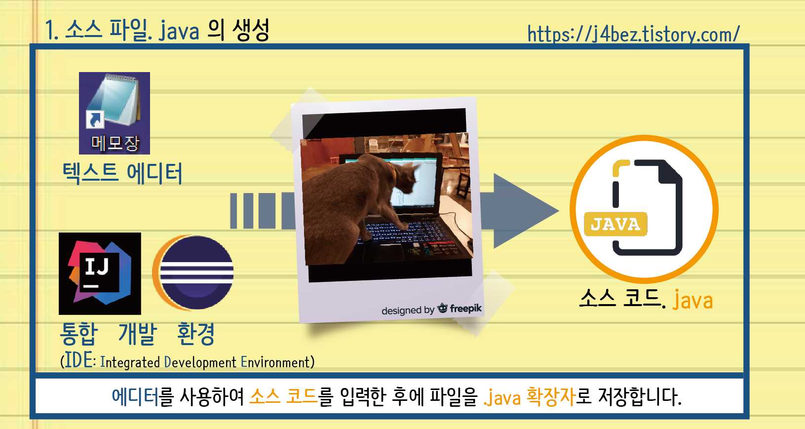 > 통합 개발 환경(IDE: Integrated Development Environment) 이란?텍스트를 수정하여 소스 코드를 작성하는 에디터 와 컴파일하고 실행하는 디버거 와 같이소프트웨어 개발 프로세스를 지원하는 많은 도구들을 묶어서 제공하는 친구들 을 말해요. 프로그래밍계의 공구함 이라 할 수 있죠자바 IDE 로는 대표적으로 인텔리제이(IntelliJ IDEA) 와 이클립스(Eclipse) 가 있어요.