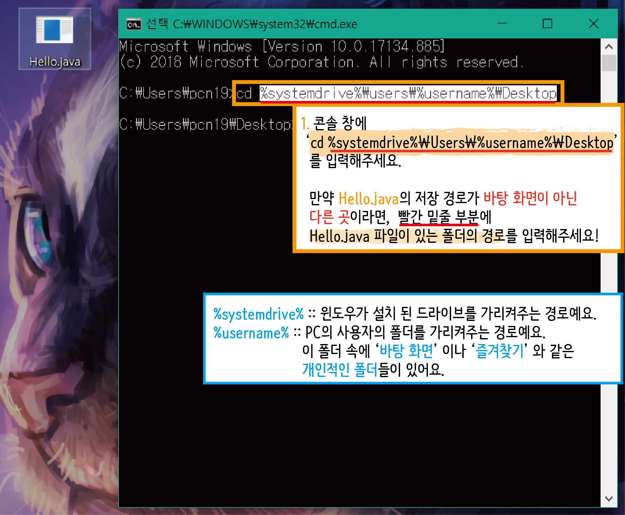 하늘색 글씨는 저번 시간에 만났던 %환경변수%와 같이 컴퓨터 내에 특정 경로를 가리켜주는 친구예요