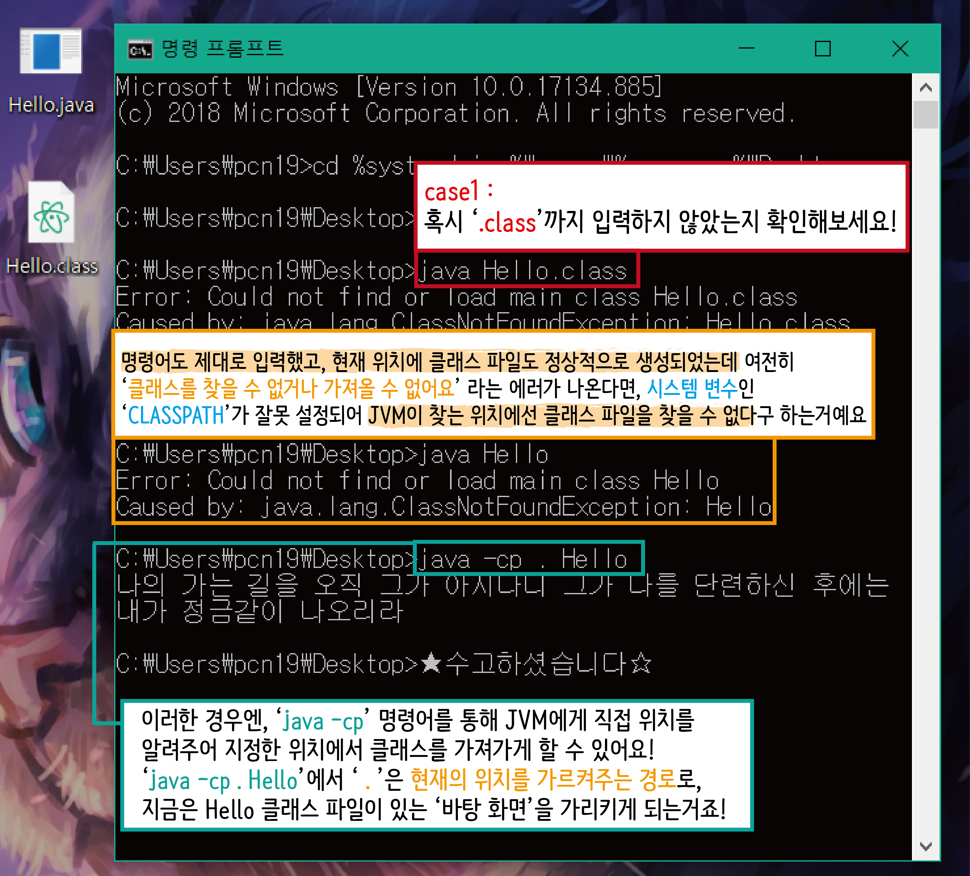물론 지금 이 상태에서도 java -cp '클래스 파일의 위치' "클래스 이름"을 통하여 자바 에게 직 접적으로 위치를 알려주어 실행하게 할 수 도 있어요! (하지만, 실행 이후엔 나중을 위해서라도 꼭 'CLASSPATH' 환경 변수를 고쳐주셔야 해요.)