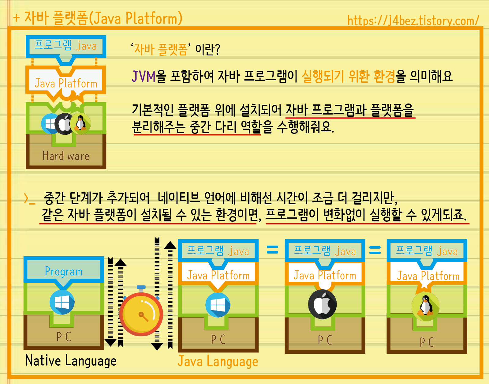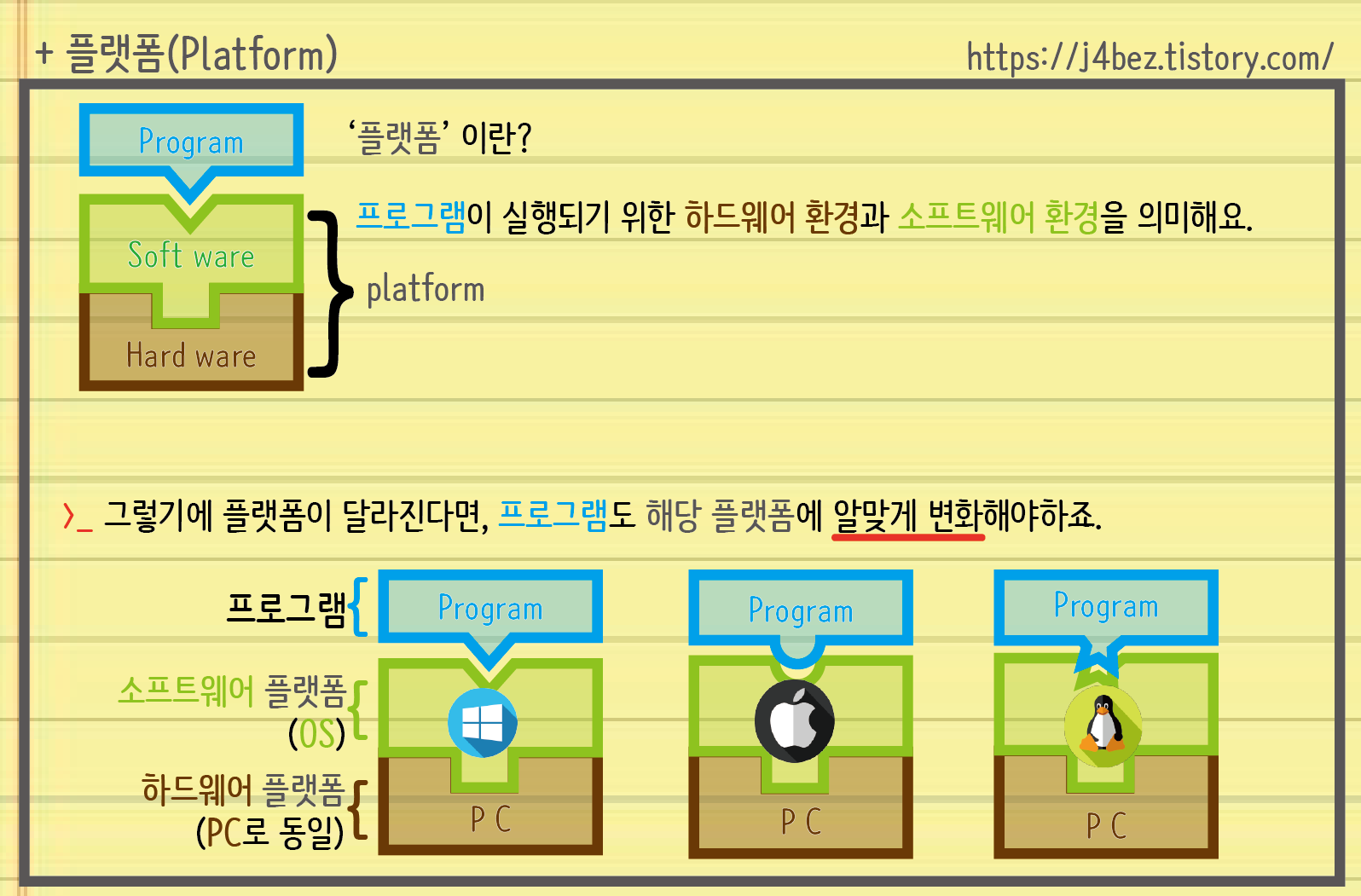 >> 자, '플랫폼'이란 개념으로 한번 더 자바 언어로 작성된 프로그램과 다른 네이티브 언어로 작성된 프로그램 사이의