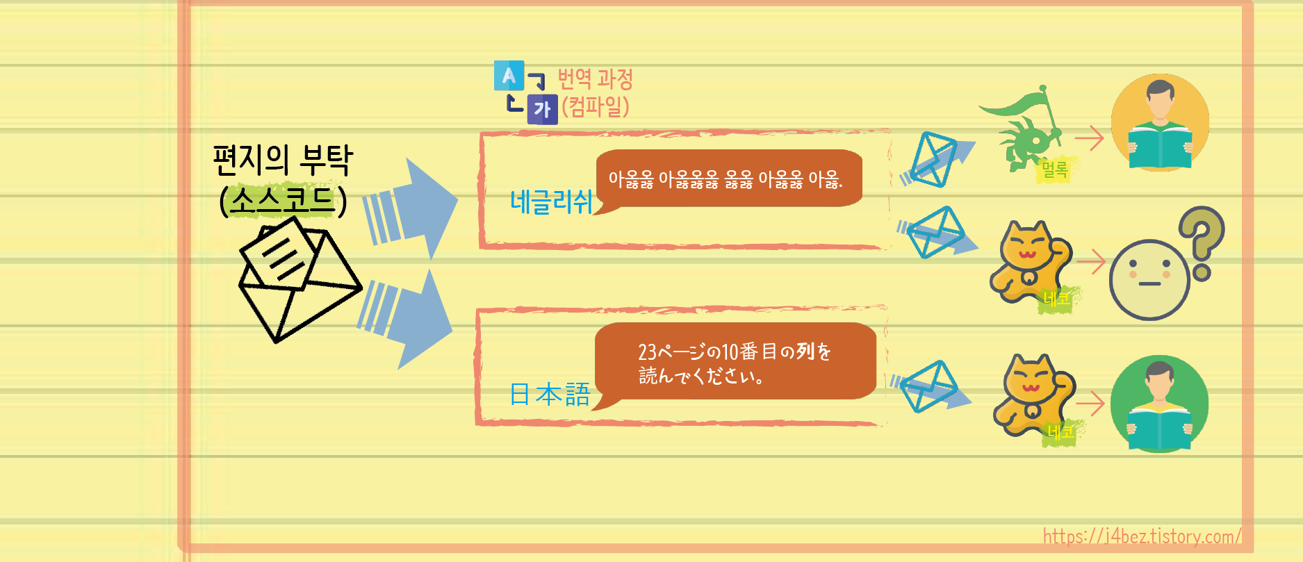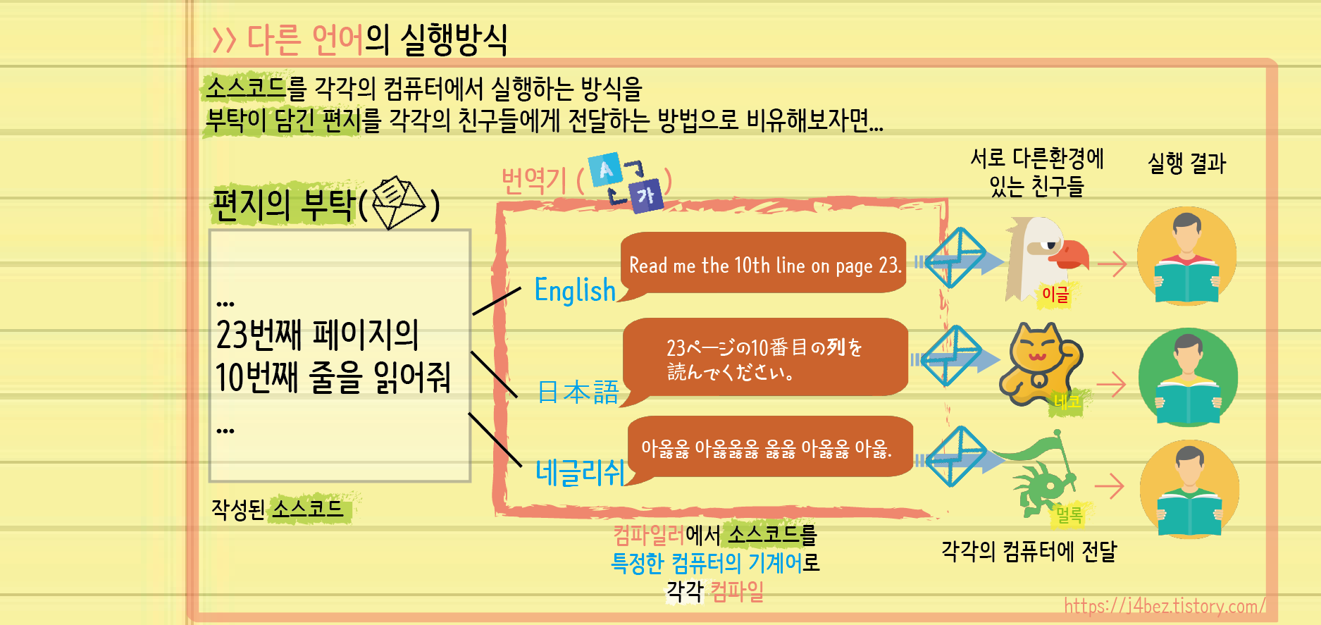 [ 소스코드가 컴파일러에 의하여 '특정한 컴퓨터의 기계어'로 변환(컴파일)되어 '특정 컴퓨터(OS)'에서 실행되고,