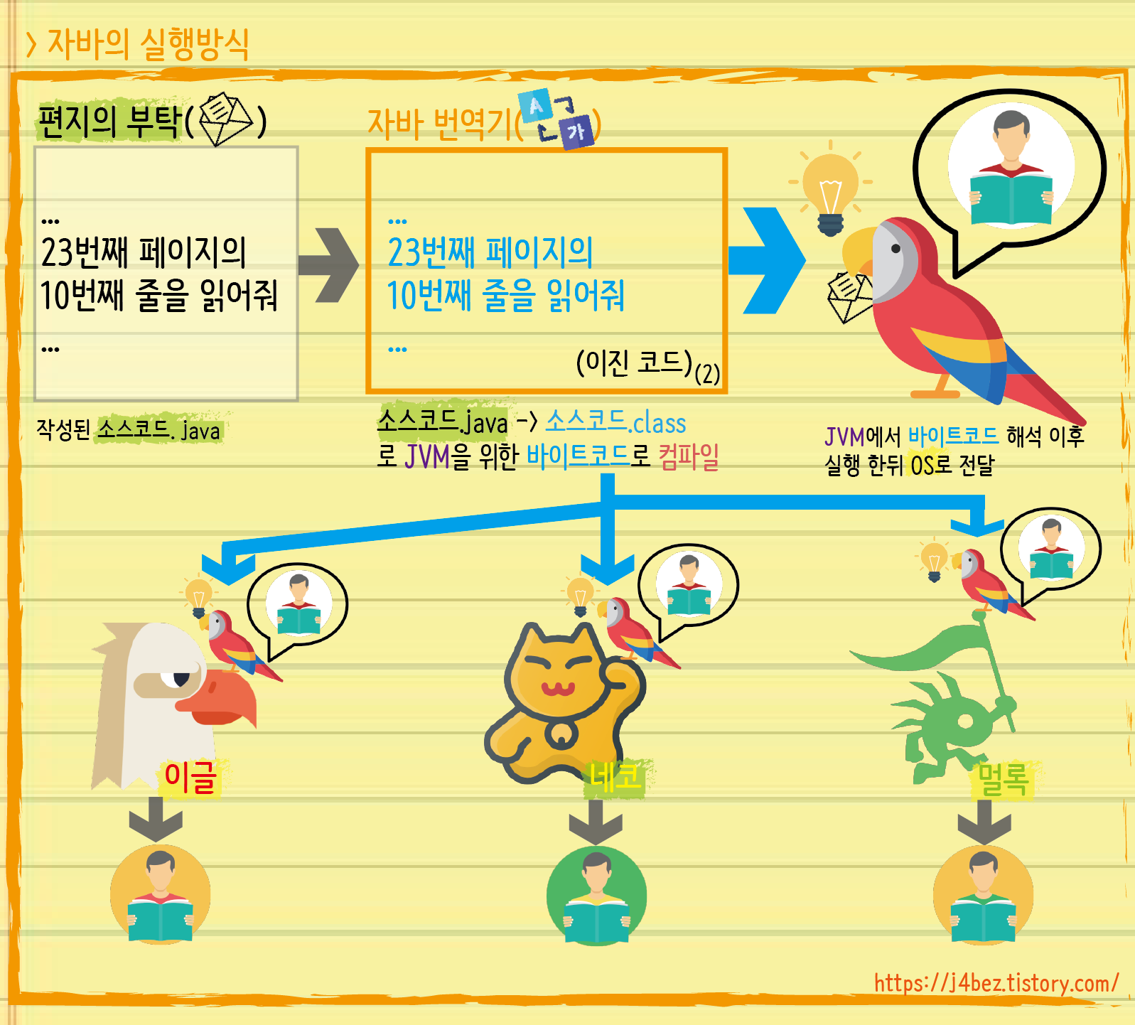 이처럼 한 단계를 더 거치는 자바의 실행방식에선 소스코드. java 가 JVM을 위한 기계어인 '바이트코드. class'로