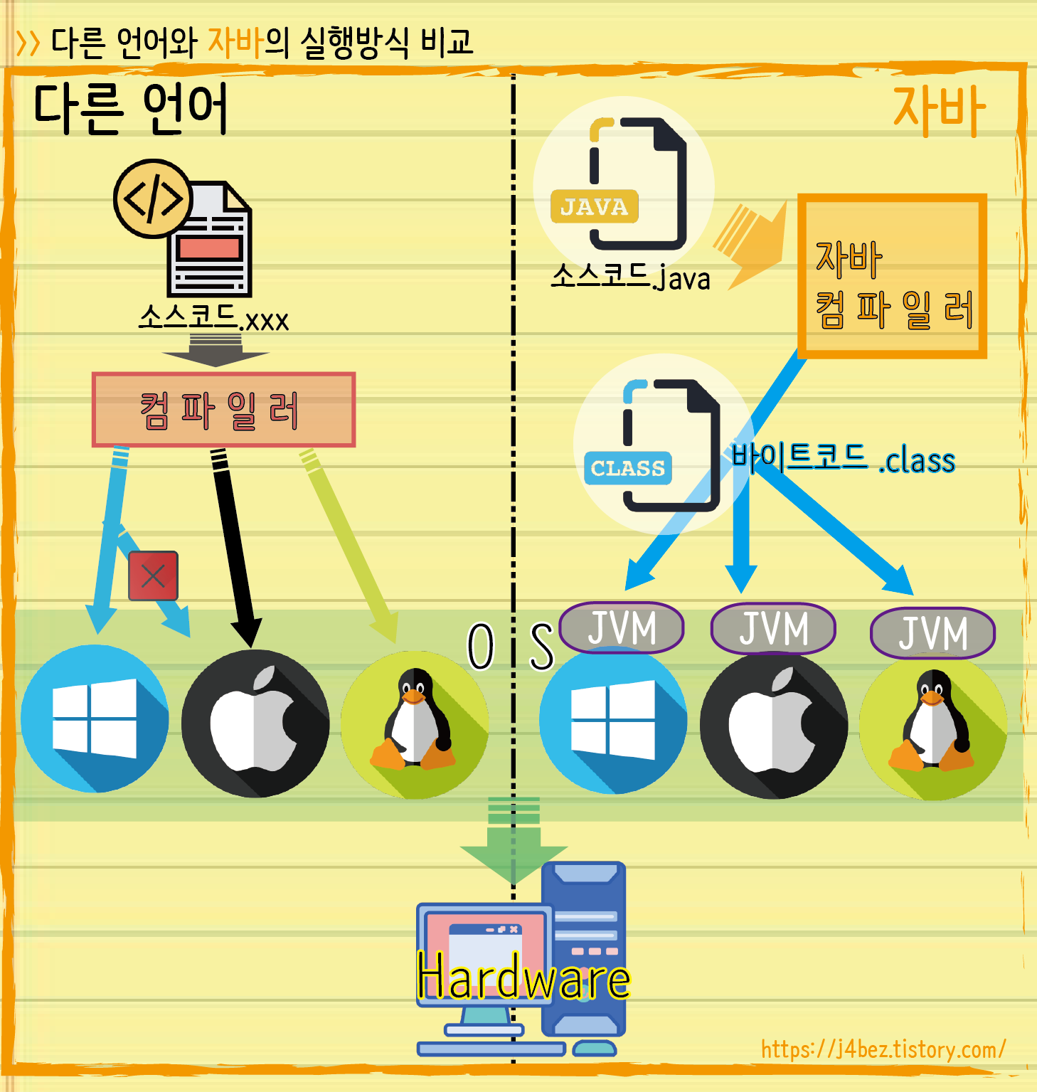 자바의 경우에는 OS로 직접 전해주지 않고, JVM(자바 가상 머신)이라는 중간단계를 거쳐서 하드웨어에 실행돼요.