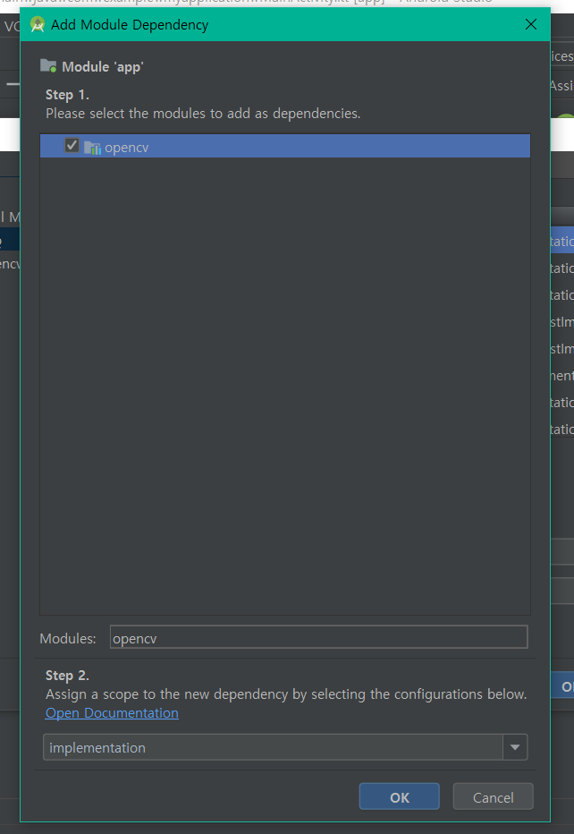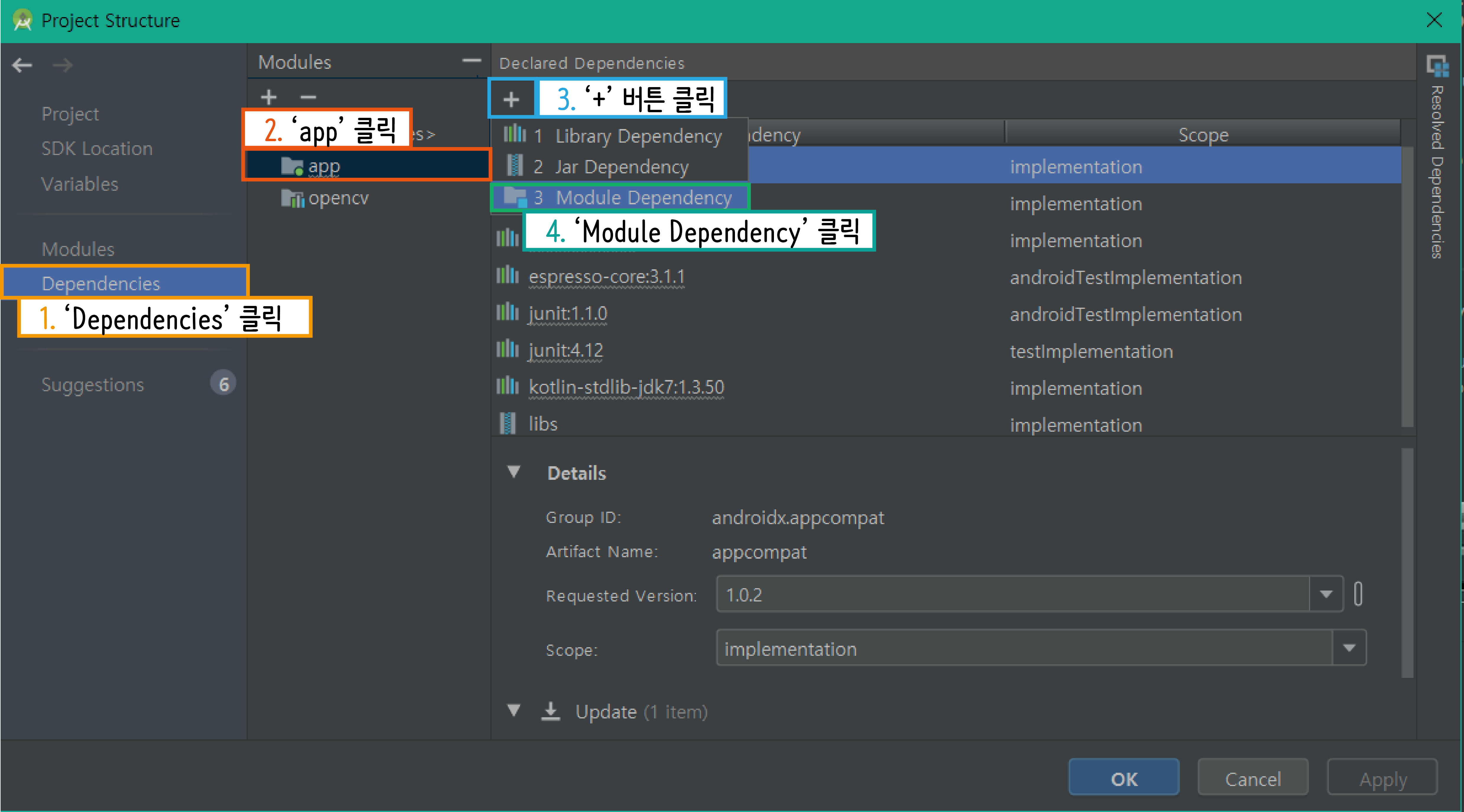 추가한 OpenCV 모듈은 App 모듈에 종속성을 더해주어야해요